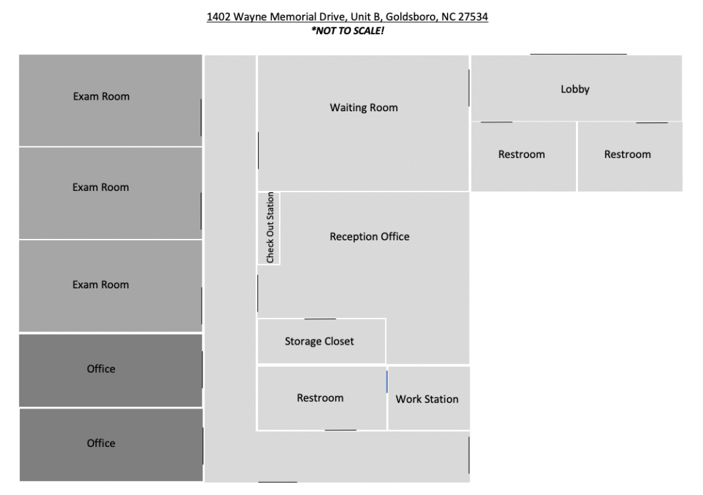 Located on Wayne Memorial Drive, this is one half of a medical office with private entrance in front and back. Waiting room, reception area, 3 exam rooms, 2 private offices, working station, private restroom, 2 shared community area restrooms.